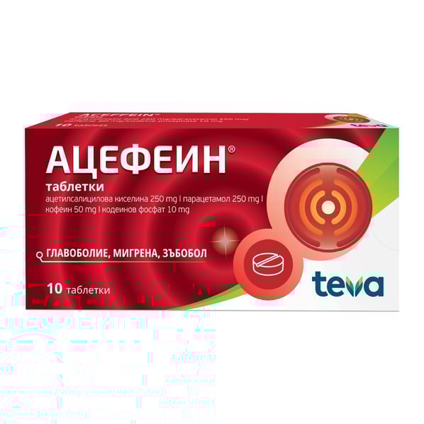 Ацефеин е комбиниран лекарствен продукт с противоболково, температуропонижаващо и по-слабо изразено противовъзпалително действие. В комбинацията противоболковото действие на отделните съставки се усилва и се намаляват страничните ефекти, поради използване на по-ниски дози на съставките. Комбинацията проявява още и следните ефекти: седативно (успокояващо) действие върху централната нервна система; благоприятен ефект върху мозъчните съдове и намаляване на вътремозъчното налягане (с ефект намаляване на главоболието). Кофеинът усилва ефекта на другите три съставки на продукта, като улеснява преминаването им през кръвно-мозъчната бариера. Този продукт съдържа кодеин. Кодеин принадлежи към група лекарства, наречени наркотични аналгетици, които действат за облекчаване на болката. Той може да бъде използван самостоятелно или в комбинация с други обезболяващи средства, като парацетамол. Кодеин притежава също и изразено противокашлично действие.