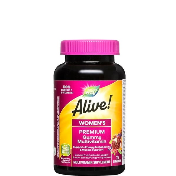 Alive Women's Gummy Vitamins представлява специална хранителна добавка за жени от Nature's Way, която съдържа мощен комплекс от прецизно подбрани витамини, минерали, плодове, зеленчуци, зелени растения и гъби, антиоксиданти, омега 3-6-9 и храносмилателни ензими, които влияят благоприятно върху всички системи и органи на женския организъм, повишават имунитета, тонуса, енергията и общото здраве на жената. Мултивитаминната формула подкрепя костите, зъбите, мускулите, кожата и укрепва сърцето и сърдечно-съдовата система и спомага за поддържането на хормонален баланс. Мултивитамините за жени Алайв влияят благоприятно върху нервната система, подобряват паметта, концентрацията и спомагат за поддържане на добро психическо и емоционално здраве. Мултивитамините Алайв спомагат за поддържането на добро зрение, здрава костна система и повишават имунитета и защитните сили на организма. Специалната формула спомага за поддържането на красив и здравословен външен вид - гладка и млада кожа, красива коса и здрави нокти. Мултивитамините за жени доставят силна антиоксидантна защита на клетките от вредното влияние на свободните радикали, предпазват от болести и клетъчно стареене. Алайв Мултивитамини за жени са с вкус на грозде, боровинка, акай и череша.