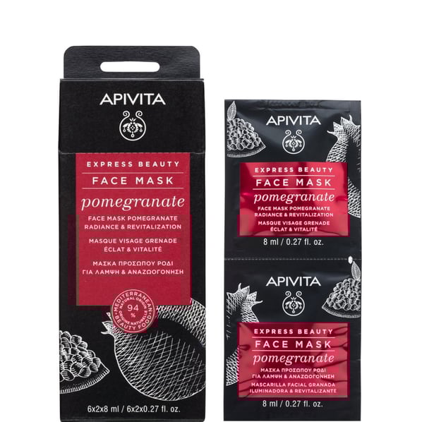 Маската за лице с нар на Апивита, възстановява естествения блясък на кожата. Тя защитава лицето от негативния ефект на свободните радикали. Останалите й съставки хидратират и тонизират. Маската е от линията Express Beauty, която е вдъхновена от средиземноморската диета и нейното богато разнообразие от плодове и зеленчуци, които ни дават ценни вещества, доставящи балансирана храна и здраве на нашата кожа. Водата във формулата е заменена с антиоксидантна инфузия от гръцки планински чай с антиоксидантно действие. Дерматологично тестван. Не съдържа парабени, силикони, пропилен гликол, етаноломини, фталати, минерални масла, РСМ, NM.