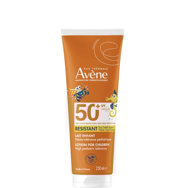 Avene Sun Resistant Lotion for children SPF 50+ е лосион за слънцезащита под формата на мляко, подходящ за чувствителната детска кожа. Нанася се лесно, устойчиво на вода, пясък и пот. Формулирано да гарантира високо ниво на слънцезащита, като хидратира и предоставя комплекс от фотозащитни активни съставки, осигуряващи оптимална защита срещу всички дълги и къси UVB-UVA слънчеви лъчи. Подходящо за лице и тяло. Авен Слънцезащитно мляко за деца SPF50+ притежава фотоустойчвост, не съдържа силикон и парабени, притежава висока педиатрична поносимост.