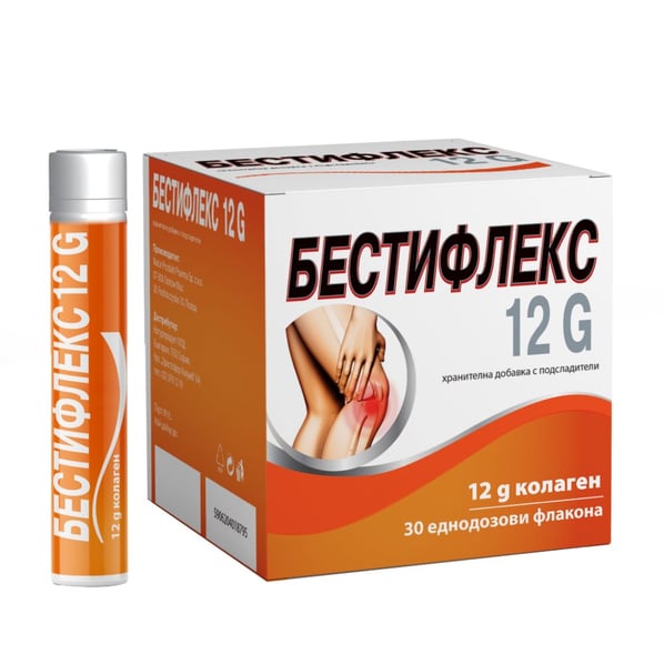 За стави и красива кожа, Bestiflex 12 г колаген от Натурпродукт, под формата на еднодозови флакони. Предназначен за пиене с течен хидролизиран добре усвоим колаген (12 000 мг), обогатен с хиалуронова киселина, биотин и витамин С за здравето на ставите, ставния хрущял и кожата. Продуктът съдържа висока доза колаген, подходящ за: активно спортуващи, при усилено натоварване на ставите за възстановяване на ставната повърхност и за хора с наднормено тегло. Комбинира свойствата с тези на хиалуронова киселина, биотин и витамин С, като заедно допринасят за свежия вид на кожата. С вкус на грозде. Без аспартам.