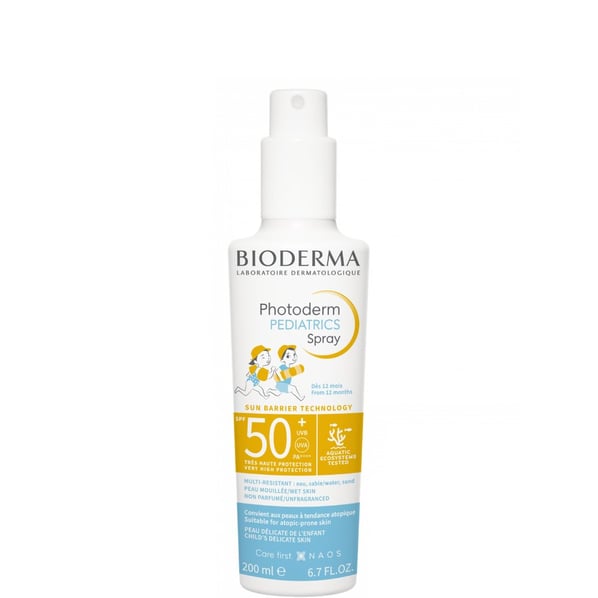 Слънцезащитен спрей за суха, атопична кожа при деца над 12 месеца, за лице и тяло. Биодерма Фотодерм Педиатрикс има хидратиращо действие Sun Barrier Technology спомага за собствените защитни сили на деликатната бебешка кожа при излагане на слънце, с широкоспектърна защита, оптимизрана срещу къси и дълги UVA лъчи, антиоксидант, който подсилва кожната бариера. Устойчив на вода, пясък, изпотяване и подсушаване с кърпа. Лесно нанасяне, бърза абсорбция, невидим завършек. Без аромат. Без лепкав ефект. Не е мазен. Много добра кожна и очна толерантност.