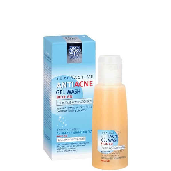 Bodi Beauty Bille GD Superactive Anti-Acne Gel Wash представлява висококачествен козметичен продукт, предназначен за справяне с акнето. Боди Бюти Биле ГД Супер активен анти-акне измиващ гел почиства порите, почиства грима и замърсяванията с нежна пяна. Също така отстранява излишния себум и мъртвите рогови клетки. Нормализира хидролипидния баланс, pH-то, връща жизнеността и здравия вид на епидермиса. Формулата включва комплекс от билкови екстракти - розмарин, смрадлика, маточина, както и масло от чаено дърво и алантоин. За мазна и смесена кожа, за мъже и жени, за всяка възраст. Без минерални масла. Без парабени. Без парфюм.