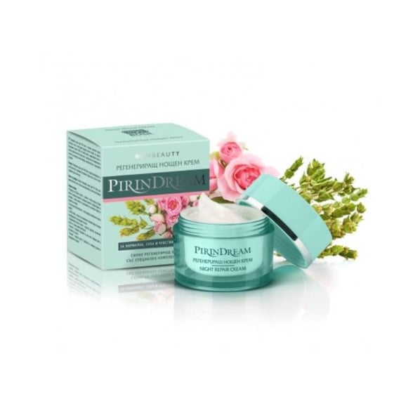 Bodi Beauty Pirin Dream Regenerating Night Cream е висококачествен козметичен продукт, осигуряващ възстановяване и подмладяване на кожата на лицето. Боди Бюти Пирин Дрийм Регенериращ нощен крем за лице също така придава мекота и нежност на епидермиса, спомага за съхраняването на естествения му баланс и му осигурява важни хранителни вещества. Кремът се отличава с богата и деликатна текстура. Употребата му помага за преодоляване на резултата от вредните външни влияния, на които кожата е подложена през деня. Кремът възстановява младия и жизнен вид на кожата. Специалната му формула се отличава със съдържащите се в нея екстракти от мурсалски чай и българска роза, осигуряващи противовъзпалително, регенериращо и успокояващо действие. В състава на крема са още витамини, овлажнители, Dermaxyl™, регенериращи кожата, редуциращи бръчките, предпазващи от преждевремнно стареенето. С крема лицето придобива младежко и сияйно излъчване с редуцирани бръчки. За суха, чувствителна и нормална кожа. Клинично тестван.