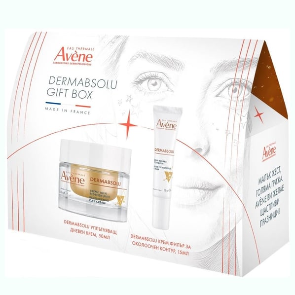 Комплект Avene DermAbsolu съдържа: 1 бр. Avene DermAbsolu Уплътняващ дневен крем x50 мл + 1 бр. Avene DermAbsolu Крем филър за околоочен контур x15 мл.