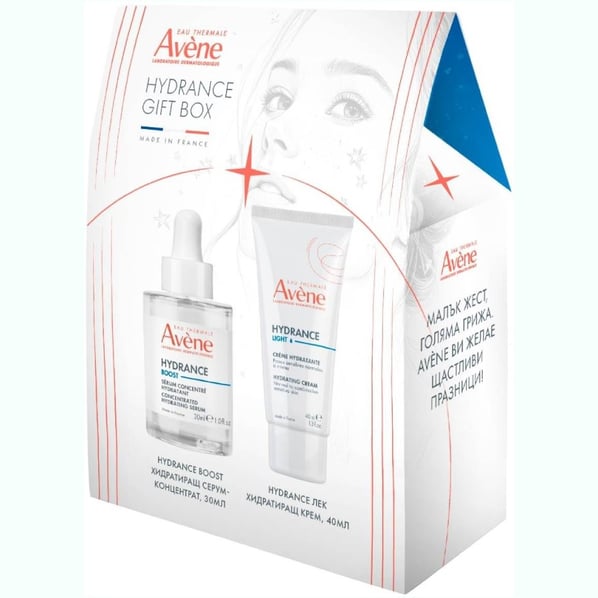 Kомплект Avene Hydrance съдържа 1 бр. Avene Hydrance Boost Хидратиращ концентрат за лице х30 мл + 1 бр. Avene Лек хидратиращ крем х40 мл.