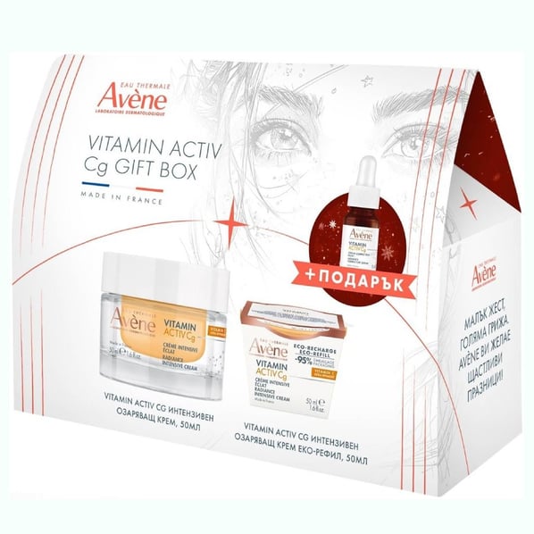 Kомплект Avene съдържа: 1 бр. Vitamin Activ Cg Интензивен озаряващ крем x50 мл + 1 бр. Vitamin Activ Cg Интензивен озаряващ крем пълнител x50 мл+ Hyaluron Activ B3 Серум концентрат за лице с изпълващо действие x10 мл.
