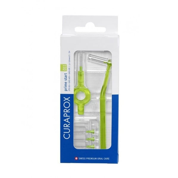 Curaprox CPS prime start 011 Интердентални четки за зъби с кръгъл и прав държач са 5 броя интердентални четки и два удобни държача (прав и кръгъл), на които може да се поставят. Нова клик система за удобно и хигиенично изваждане на допълнителните глави към основните държачи. Размерът на интерденталните четки е 011 (1,1 – 5,0 мм). Курапрокс CPS прайм старт 011 Интердентални четки за зъби с кръгъл и прав държач почистват ефективно цялото интердентално пространство. При създаването им е използван материалът CURAL, който представлява много тънка и здрава хирургична тел. Почистването на междузъбните зони спомага за намаляване на риска от образуване на плака и кариеси в съответните места.
