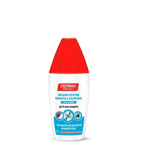 Derma Intensive+ Лосион против комари и кърлежи с Алое Вера за максимална защита Rubella е репелентен под формата на гел, предпазващ от комари и кърлежи. Дерма Интензив+ Лосион против комари и кърлежи с Алое Вера за максимална защита Рубелла осигурява защита от комари до 8 часа и от кърлежи до 7 часа. Може да се прилага при деца над 12 години и възрастни. Продуктът е със специална формула с DEET в концентрация от 30% в комбинация с масло на лимонов евкалипт, отговорни за високата ефективност на продукта. Обогатена е и с екстракт от Алое Вера - билка, действаща успокояващо и хидратиращо на кожата. Репелентът е в практична опаковка със спрей-помпа, позволяваща удобно нанасяне. Субстанцията попива бързо, не омаслява, кожата остава суха, без лепкав филм. Оставя лек и приятен аромат на лимонов евкалипт.