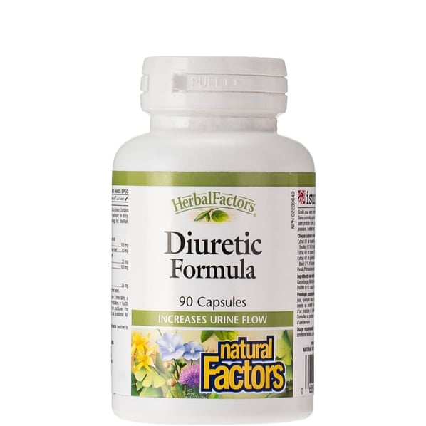 Diuretic Formula от Нейчъръл Факторс въздейства върху процесите на отделителната система. Продуктът се употребява при задържане на течности, като стимулира премахването на ненужната вода в урината и възпрепятства нейното задържане в тъканите. Съдейства за детоксикацията на тялото и ограничаването на отоците в него. Въздейства върху здравословната загуба на тегло. Продуктът съдържа мечо грозде, корен от магданоз, червена боровинка и глухарче. Не съдържа: изкуствени консерванти, оцветители и подсладители, млечни продукти, соя, пшеница, мая.