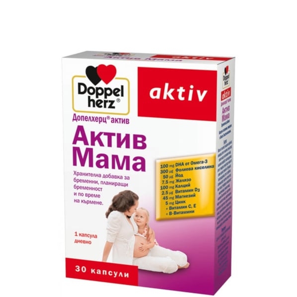Допелхерц Актив Activ Mama съдържа 12 витамина, 5 минерала и микроелемента, важни за бъдещите майки, бременните и кърмещите жени. Те са съчетани с омега-3 мастни киселини, които подпомагат сърцето, мозъка и зрението на плода и кърмачето. Фолиевата киселина допринася за нормалното развитие и нормалния растеж на тъканите на плода. Тя участва в процесите на клетъчно делене, които са в основата на вътре-утробното развитие, като този процес се подпомага и от желязото, цинка и витамините В12 и D3. Желязото съдейства за синтеза на хемоглобин, нужен за формирането на червени кръвни клетки и пренасянето на кислород в кръвта. Елементът йод спомага за нормалното функциониране на щитовидната жлеза и участва в синтеза на нейните хормони. В-витамините са важни за дейността на нервната система. За нормалната функцията на имунната система допринасят витамините А, D, C, В6, В12, фолиева киселина и микроелементите желязо и цинк. Не съдържа лактоза и глутен.