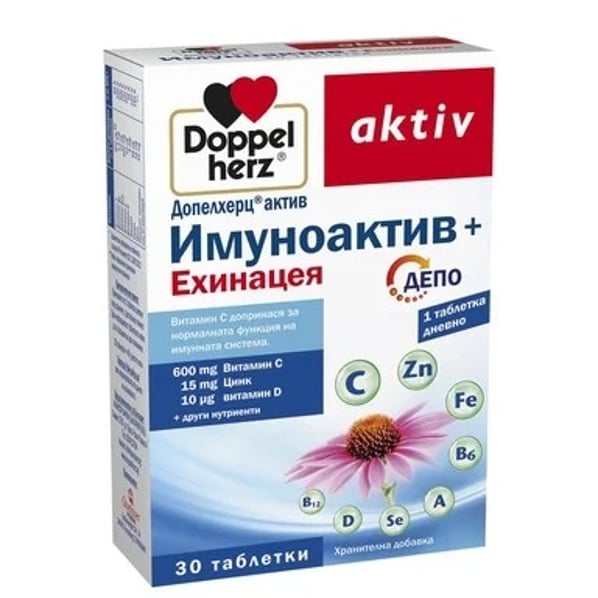 Допелхерц Имуноактив с Ехинацея е продукт, който подпомага нормалните функции на имунната система. Укрепва съпротивителните сили на организма и защитава клетките от оксидативен стрес. Съдейства за по-бързото възстановяване след боледуване и намалява чувството на умора и отпадналост, доставяйки на тялото повече енергия и тонус. Препоръчителен е приемът на Имуноактив през есенно-зимния период, когато рискът от инфекции е завишен. Съдържа Ехинацея, която укрепва по естествен начин имунитета. Тя притежава антибактериални, противовъзпалителни и антиоксидантни свойства и понижава риска от настинка. Комбинацията от витамини C, D, A, B6 и B12 е с благоприятен ефект върху имунните функции.