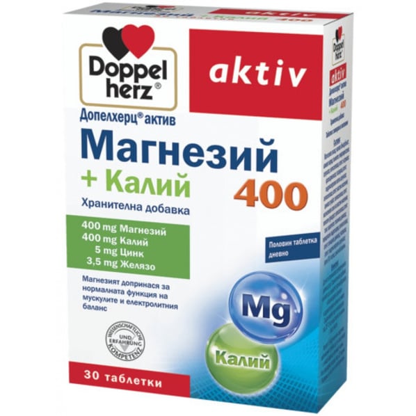 Снабде с оптимално количество витамини и минерали, Допелхерц актив Магнезий 400 + Калий подпомага нормалната функция на мускулите и нервната система. Магнезият допринася за поддържане на електролитния баланс и правилната мускулна функция, а калият участва в регулирането на водния баланс. Двата заедно поддържат нормалното кръвно налягане. Обогатен още с желязо, цинк, хром, витамин B6 и Витамин В12.