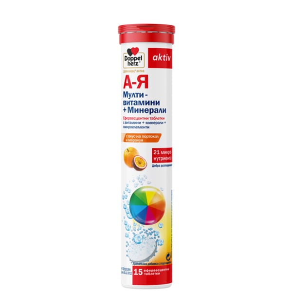За активиране на естествените защитни сили на организма, комбинация от витамини и минерали Допелхерц А-Я, в разтворима форма за по-бързо усвояване. С аромат на портокал и маракуя. Подходящи за употреба от лица над 18-годишна възраст, при умора, отпадналост, физически натоварвания, боледуване и нездравословен начин на живот. С антиоксидантни свойства за укрепване на имунната система.