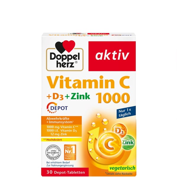 Допелхерц Актив Vitamin C 1000 + D3 + Zink DEPOT подкрепя имунитета. Витамин С подпомага правилната функция на имунната система, нормалното протичане на метаболизма и производството на енергия. Съдейства за понижаването на чувството на отпадналост и умора през периода на настинка. Участва в синтеза на колаген за нормалната функция на кръвоносните съдове, сухожилията, костите, зъбите. За здравето на костната система допринася и витамин D, както и нормалното количество на калций в кръвта. Той е важен за имунната система, както и цинка. Микроелементът цинк предпазва клетките от оксидативен стрес, допринася за деленето на клетките и поддържа здравето на косата, кожата и ноктите, както и за нормалния фертилитет и възпроизводство. Депо таблетката позволява постепенно освобождаве на хранителни вещества, като така остават в организма за по-дълго. Не съдържа лактоза и глутен.