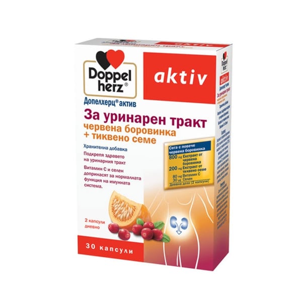Капсулите на Допелхерц Актив съдействат за нормалната функция и естествена резистентност на уринарния тракт и нормална функция на пикочния мехур и простатата, има оптимална антиоксидантна клетъчна защита и укрепва имунната система. Комбинация от естествени екстракти от червена боровинка и тиквено семе, която благоприятства нормалното състояние на уринарния тракт. Нова формула с повишено съдържание на червена боровинка. Концентрираният екстракт от Американска червена боровинка (Vaccinum macrocarpon) е богат източник на биофлавоноиди, естествени фенолни съединения, проантоцианидини тип А, които благоприятстват за повишаване на естествената резистентност и поддържане на нормалната функция на уринарния тракт. Екстрактът от тиквено семе е естествен източник на фитостероли, витамини и микроелементи, който допринася за нормалната функция на пикочния мехур и простатата. Витамин С и селен благоприятстват защитата на клетките от оксидативен стрес и допринасят за нормалната функция на имунната система.