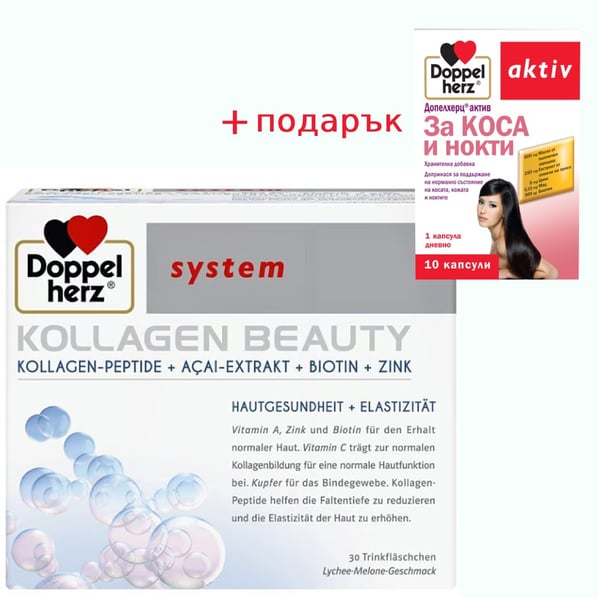 При всеки закупен продукт Doppelherz system Колаген Бюти, получавате подарък Doppelherz aktiv за коса и нокти х10 капсули.