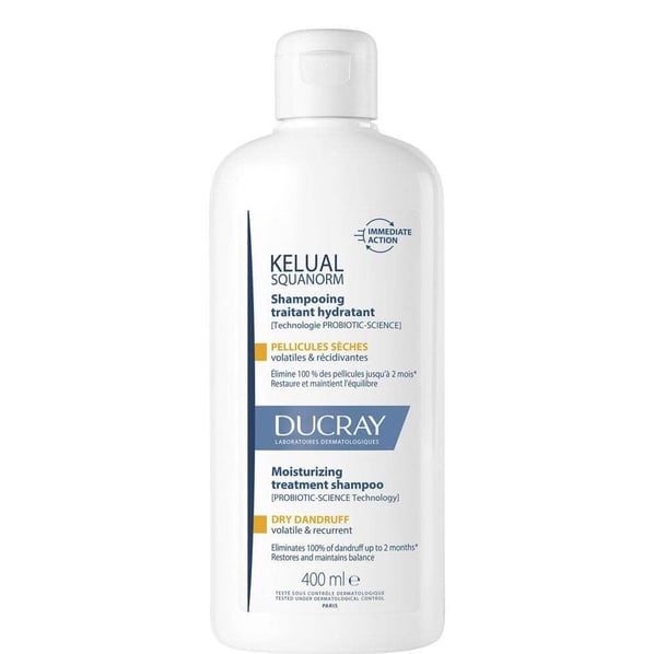 Ducray Kelual Squanorm Dry Dandruff Shampoo е шампоан против сух пърхот, който почиства косата, елиминира пърхота, хидратира и успокоява дълготрайно скалпа. Резултатите са видими още след първата му употреба, благодарение на ефикасната си формула. Съдържа комбинация от активни съставки вдъхновени от пробиотичната грижа - Probiotic Science, които премахват пърхота, възстановяват баланса и хидратират сухата кожа на главата. Дюкре Скванорм Хидратиращ и третиращ шампоан против сух пърхот е с деликатен аромат на цветя и кремообразна текстура, което го прави приятен за употреба. Той предпазва от повторна поява на пърхот в рамките на до 2 месеца. Придава мекота и блясък на косата.