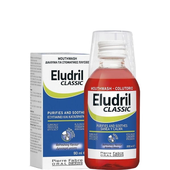 Комплект Eludril Classic съдържа: 1 бр. Вода за уста x200 мл + 1 бр. Вода за уста x90 мл.