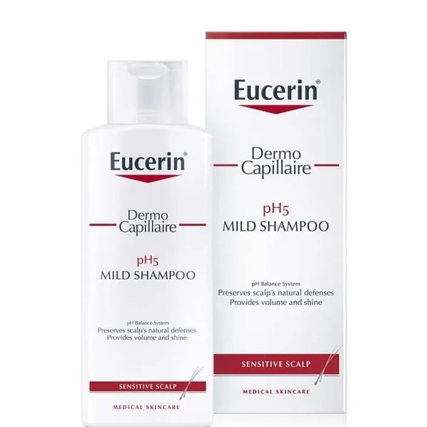 Eucerin DermoCapillaire pH5 Mild Shampoo e шампоан за чувствителен скалп. Подходящ за деца и бебета. Шампоанът ефективно почиства скалпа и косата, поддържа естественото pH ниво на кожата, като предпазва от изсушаване и раздразнение. Еуцерин (Юсерин) ДермоКапилиар pH5 шампоан за чувствителен скалп има нежна формула, която ефективно успокоява скалпа и намалява сърбежа още при първото измиване. Шампоанът отмива замърсяванията, полените и алергените и придава на косата здравословен вид, блясък и усещане за плътност и мекота.