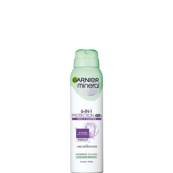 Garnier Mineral Protection 6 Floral Fresh Anti-Perspirant е дезодорант - спрей за жени против изпотяване, предназначен за ежедневна употреба. Гарние Минерал Протекшън 6 Флорал Фреш Дезодорант спрей против изпотяване за жени се грижи не само за Вашата кожа, но и за дрехите Ви. Той предпазва от изпотяване и влажни петна, благодарение на включения във формулата му естествено абсорбиращ минералит. Добавеният екстракт от моринга, притежаваща пречистващи и детоксикиращи свойства, спира бактерията отговорна за пренасянето на лошите миризми върху дрехите. Леката формула оставя деликатната кожа на подмишниците да диша и не предизвиква раздразнения, дори и след бръснене, защото не съдържа етилов алкохол. Дезодорантът предпазва от неприятни миризми в продължение на 48 часа и оставя лек дискретен аромат. Подходящ за всеки тип кожа.