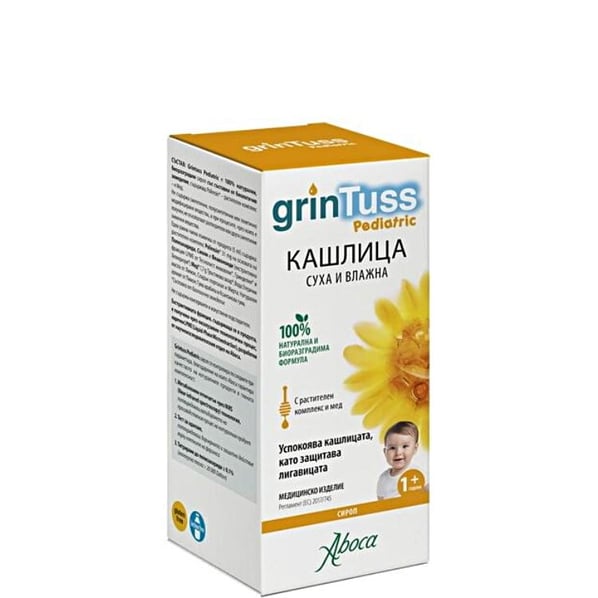 Гринтус Педиатрик е детски сироп срещу суха и влажна кашлица от Абока, който включва растителен комплекс и мед във 100% натурална и биоразградима формула. Той защитава лигавицата и успокоява раздразнението. Има овлажняващо действие и улеснява отделянето на секрета. С бариерен ефект, който образува защитен филм и предпазва от контакт с дразнещите агенти, лубрикантно действие, което намалява триенето на фаринкса, причиняващо кашлица. Показан за лечение както на суха, така и на влажна кашлица при деца над 1 година. Не съдържа глутен.