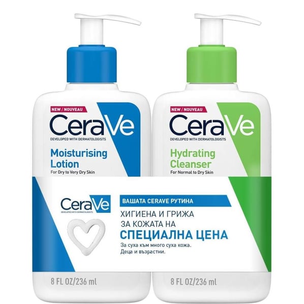 CeraVe комплект включва: 1 бр. Хидратиращ лосион за суха кожа х236 мл + 1 бр. Хидратиращ измиващ крем х236 мл.
