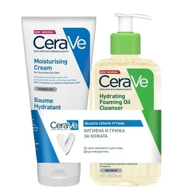 Комплект CeraVe Хидратиращо измиващо олио за лице и тяло х236 мл + Хидратиращ крем за лице и тяло х177 мл съдържа: 1 брой CeraVe Хидратиращо измиващо олио за лице и тяло х236 мл + 1 брой CeraVe Хидратиращ крем за лице и тяло х177 мл