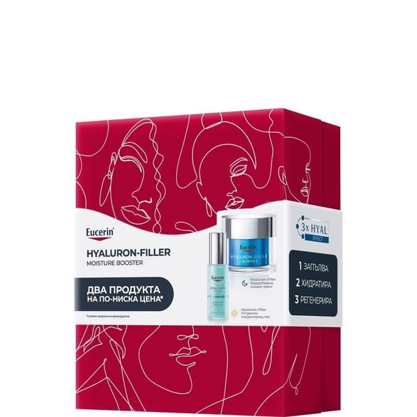 Комплект Eucerin Hyaluron-Filler съдържа: 1 бр. Ултралек хидратиращ гел х30 мл + 1 бр. Хидратиращ нощен бустер за всеки тип кожа х50 мл.