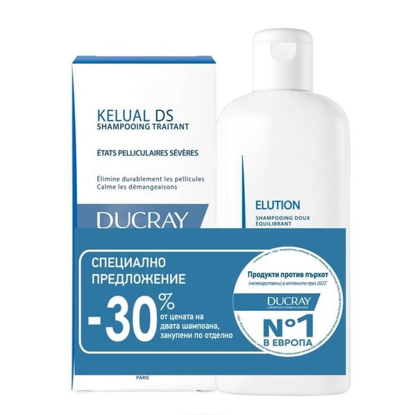 Ducray комплект включва: 1 бр. Kelual DS Третиращ шампоан x100 мл + 1 бр. Elution Ребалансиращ шампоан х200 мл.