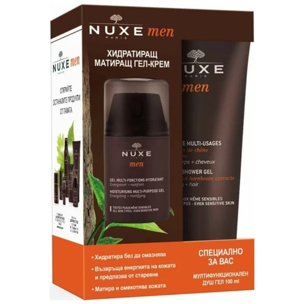 Комплект Nuxe Men Хидратиращ матиращ гел-крем за лице за мъже x50 мл + Душ гел за лице, коса и тяло х100 мл