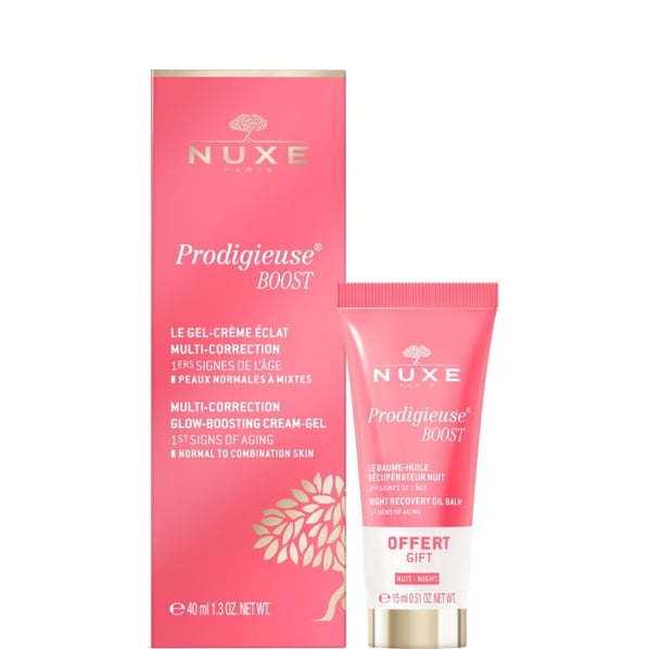 Комплект Nuxe Prodigieuse Boost включва: 1 бр. Мулти-коригиращ гел крем х40 мл + 1 бр. Възстановяващ нощен балсам х15 мл.