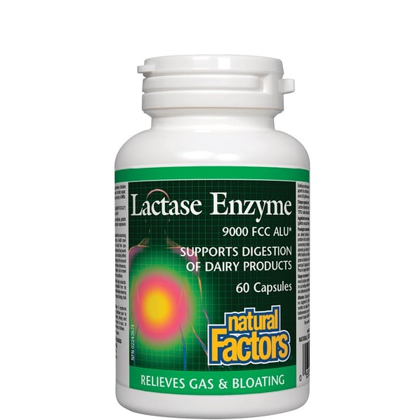 Lactase Enzyme от Нейчъръл Факторс допринася за храносмилане на лактозата. Действието на лактазата се състои в това, че преобразува лактозата в смилаема форма. Успокоява състоянието при лактозна непоносимост, лактазна недостатъчност, както и смущенията на стомашно-чревния тракт след употребата на млечни продукти, като подут корем, газове, спазми. Допринася за разграждането на млечните храни. Не съдържа: изкуствени оцветители, консерванти, подсладители, млечни продукти, захар, пшеница, глутен, мая, соя, яйца, рибни, черупчести и морски продукти, сол, ядки, ГМО.
