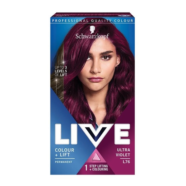 С дълготрайната боя за коса Live Colour + Lift е възможно да постигнете наситен цвят в нюанс L76 Ултра виолетов дори и при тъмна коса. Формулата е специално разработена за да изсветлява косата до 3 тона с ефект без медни оттенъци. Високо концентрираният пигментен микс прониква дълбоко в косъма за постигането на ярък цвят и бляскав завършек.