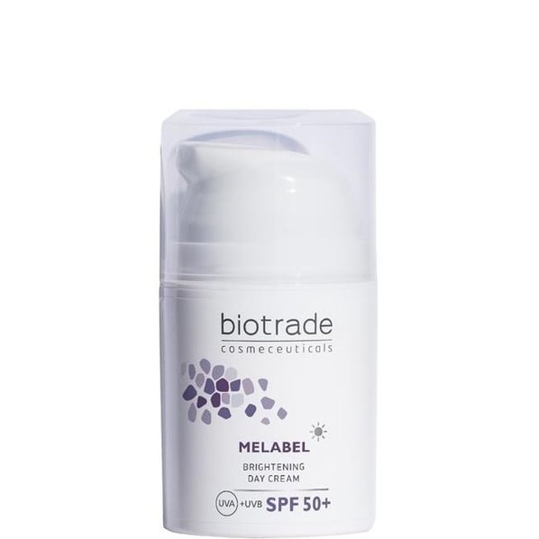 Изсветляващият дневен крем Мелабел от Биотрейд намалява видимостта на тъмните петна по кожата като: слънчеви изгаряния, възрастови петна, петна след бременност, акне и хормонална терапия, лунички. Предпазва от повторни пигментации и от фотостареене. С много висока UVA/UVB слънцезащита (SPF50+). Съдържа фитинова киселина, която стимулира синтеза на колаген и изравнява тена на кожата. Попива бързо и лесно, без да оставя мазен филм. Може да се използва като основа за ежедневен грим. Може да се употребява при: наличието на лунички, старчески петна, петна от акне, различни видове пигментации, петна от бременност, хормонални петна, както и петна от слънцето. Подходящ за всеки тип кожа, страдаща от хиперпигментации.