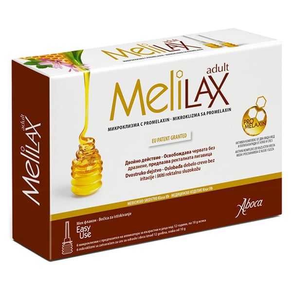 Mикроклизмата за възрастни Мелилакс от Абока са подходящ за лечение на запек, дори при наличие на висцерална свръхчувствителност (например при раздразнен колон), рагади и хемороиди. Може да се прилага по време на бременност и кърмене. Съдейства за намаляване на дразненето, дискомфорта и възпалението и спомага за освобождаването на червата. Съдържа мед, който освобождава червата без да ги дразни и предпазва ректалната лигавица. Promelaxin комплекс от нектарен и манов мед, подбрани и обработени в съответствие с тяхното съдържание на меланоидини, монозахариди и полизахариди, обогатени с полизахаридна фракция от слез и алое.
