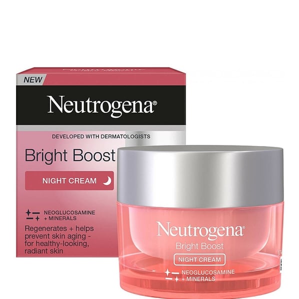 Neutrogena Bright Boost Night Cream е нощен крем за лице, който озарява, регенерира и подхранва кожата през нощта. Подходящ за всеки тип кожа. Нютроджина Брайт Бууст Нощен крем допълва естествения процес на възстановяване на кожата през нощта и помага за предотвратяване на стареенето, за здрава и по-сияйна кожа. Специалната формула съдържа висока концетрация на неоглюкозамин - некиселинна амино-захар, която активира естествения процес на обновяване на кожата и го ускорява с 10 пъти. Тя научно доказано помага за предотвратяване на хиперпигментация и намаляване появата на тъмни петна. Освен това предотвратява и намалява появата на фини линии и бръчки. При редовна употреба, кожата става по-равномерна и сияйна. С лека тесктура. Без парабени. Дерматологично тестван продукт.