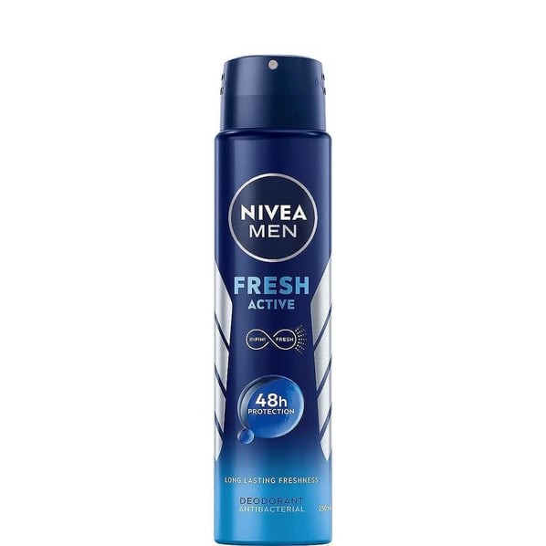 Нивеа Мен Фреш Актив е дезодорант спрей за мъже, който предоставя 48-часова защита от лоши миризми и оставя дълготраен, свеж аромат. Продуктът премахна неприятната миризма от тялото, грижи се за кожата и изсъхва бързо върху нея. Неговата формула Nivea infinifresh притежава антибактериално действие, като не замаскира миризмата, а елиминира бактериите, преди да се появи лоша миризма. С морски екстракти и без съдържание на етилов алкохол. Дерматологично тестван.
