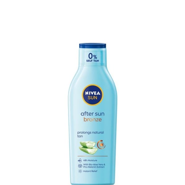 Nivea Sun After Sun Bronze Lotion е лосион за след слънце, койт запазва тена и осигурява дълготрайна хидратация. Специалната формула съдържа естествен екстракт от промеланин, който стимулира производството на меланин в кожата. Нивеа Сън Афтър Сън Бронз Лосион за след слънце поддържа дълготраен и красив тен, като предотвратява сухото усещане, сърбеж и белене. Подходящ за всеки тип кожа. Без парзбени.