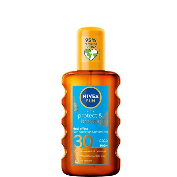 Nivea Sun Protect and Bronze Body Oil SPF30 е слънцезащитно олио за активиране на тена, което осигурява надеждна защита от вредното влияние на слънчевите лъчи, предотвратява преждевременното стареене и подпомага естествения процес на почерняване на кожата за красив естествен тен. Формулата му съдържа натурален про-меланин екстракт, който стимулира естествения процес на почерняване за дълготраен, здравословен и красив тен без автобронзант. Съдържанието на UVA/UVB защитна система предпазва кожата от вредното влияние на слънчевите лъчи. Нивеа Сън Протект и Бронз Слънцезащитно олио за активиране на тена SPF30 е подходящо за всеки тип кожа. Водоустойчив. Продуктът е произведен в съответствие с нормите на Европейския съюз и е съобразен с всички Европейски изисквания за UVA защита. Без парабени.