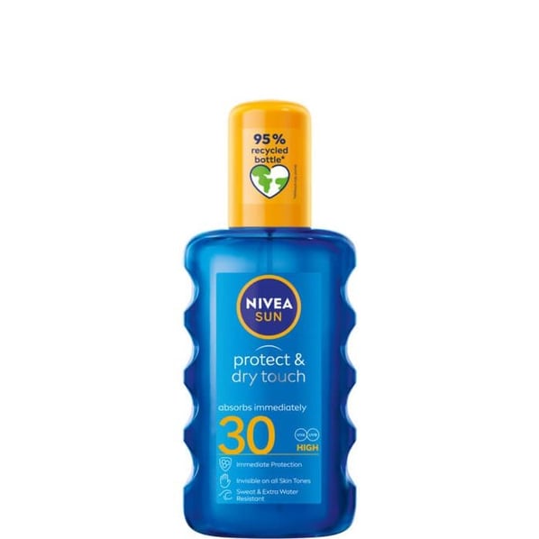 Nivea Sun Protect and Dry Touch Body Spray SPF30 e слънцезaщитен спрей за тяло, който защитава от вредното влияние на слънчевите лъчи и освежава кожата. Подходящ за всеки тип кожа. Нивеа Сън Протект и Драй Тач Слънцезащитен спрей за тяло SPF30 има приятен охлаждащ ефект за дълготраен комфорт на цялото тяло. Водоустойчив. Има немазна и прозрачна текстура, абсорбираща се бързо и не оставяща следи. Продуктът е произведен в съответствие с нормите на Европейския съюз и е съобразен с всички Европейски изисквания за UVA защита. Без парабени.
