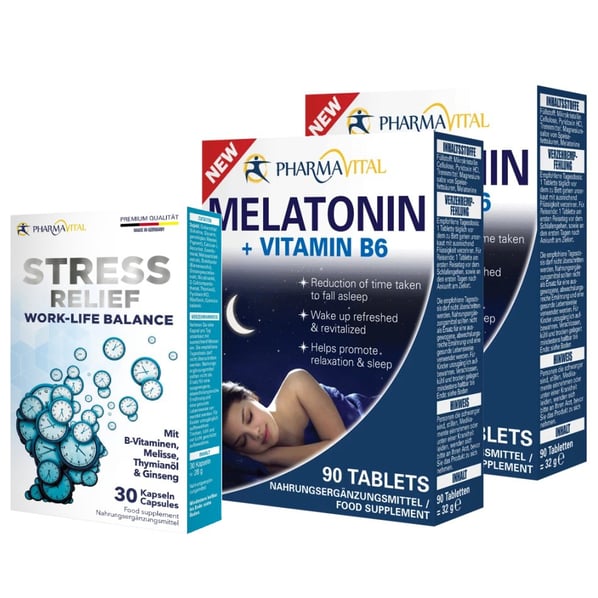 Комплект PharmaVital Стрес Релийф x30 капсули + Мелатонин и Витамин B6 2 бр. x90 таблетки
