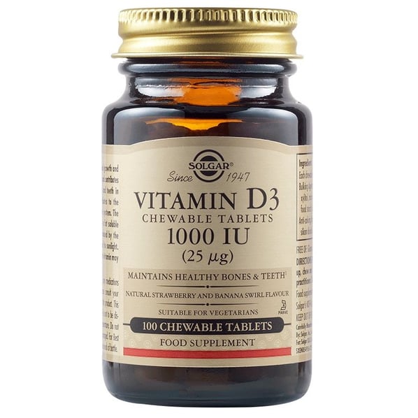 Солгар Vitamin D3 1000 IU под формата на дъвчащи таблетки с аромат на банан и ягода, подходящи за употреба при недостиг на витамин D. Витамин D е жизнено важен за усвояването на калция и фосфора от организма и има отношение към работата на щитовидната жлеза. Поддържа здравото състояние на зъбите, костите и мускулите и е важен за нормалната функция на нервната и имунната система. Без съдържание на глутен, пшеница, млечни продукти, соя, мая, консерванти, изкуствени аромати или оцветители.