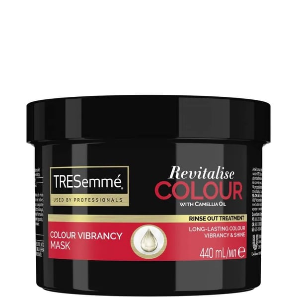 Tresemme Revitalise Colour Vibrancy Mask e маска за коса, която допринася за запазване и съживяване на цвета на боядисаната коса. Формулата съдържа масло от камелия, което омекотява и хидратира косата, като същевременно ѝ осигурява страхотен блясък. ТреСеме Ревиталайз Калър Маска за коса е подходяща за всеки тип боядисана коса. Маската спомага за лесно разресване на косата. Без парабени и силикони.