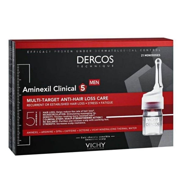 Терапията срещу косопад при жени Деркос Аминексил Клиникал 5 от Виши, под формата на моно дози е подходяща за употреба при повтарящ се или постоянен косопад и косопад вследствие на стрес и умора. Формулиран в комбинация Aminexil за намаляване на косопада, Октеин съставка, която спомага за успокояване на скалпа, Аргинин съдейства за укрепване на косата и SP94 за подобряване на здравината на косата. Лека, немазна и нелепкава текстура, богата на Aminexil и аргинин.