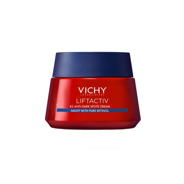 Нощен крем срещу хиперпигментации, Виши Лифтактив B3 комбинира две мощни дермокозметични активни съставки, които действат срещу съществуващите петна и превантира появата на нови. Включва концентрирана комбинация от дермокозметични активни съставки: 4% ниацинамид (B3) - спомага за редуциране на появата на тъмни петна и 0,15% чист ретинол - с противостареещи свойства за кожа, обновява клетките. Лека и немазна текстура, която бързо се абсорбира в кожата. Без алкохол. Хипоалергенен. Тестван под дерматологичен контрол.