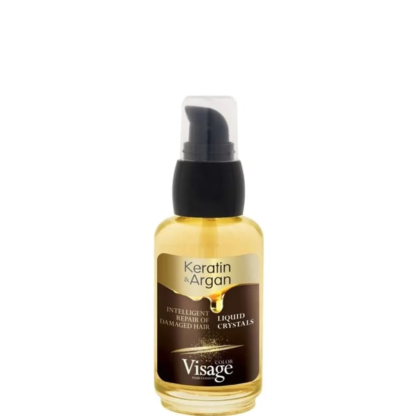 Visage Keratin and Argan Liquid Crystals са висококачествени възстановяващи течни кристали, подходящи за изтощени и третирани коси. Те съдържат комбинация от кератин и арганово масло, които имат възстановяващо и подхранващо действие и подпомагат косата да възвърне своята сила и жизненост. Визаж Течни кристали за коса с креатин и арган съдействат за запазване на здравето, блясъка виталността на косата и подпомагат нейното регенериране. Осигуряват ефикасна термозащита, което ги прави подходящи за използване за коси, които подлежат на третиране с топлина.