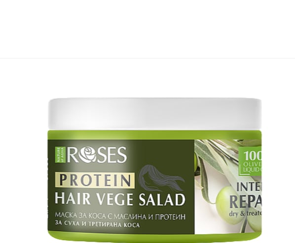 Възстановяваща маска за суха и третирана коса ВЕГЕ САЛАТА. Храна за сетивата и косата със 100% натурално масло от маслина, глицерин и пантенол. Възвръща силите и възстановява изтощената и тънка коса от корените до върха. Хидратита и заглажда косъма и му придава неустоим блясък и жизненост. Образува защитен филм като изпълва структурата му, уплътнява краищата и предотвратява цъфтежа.